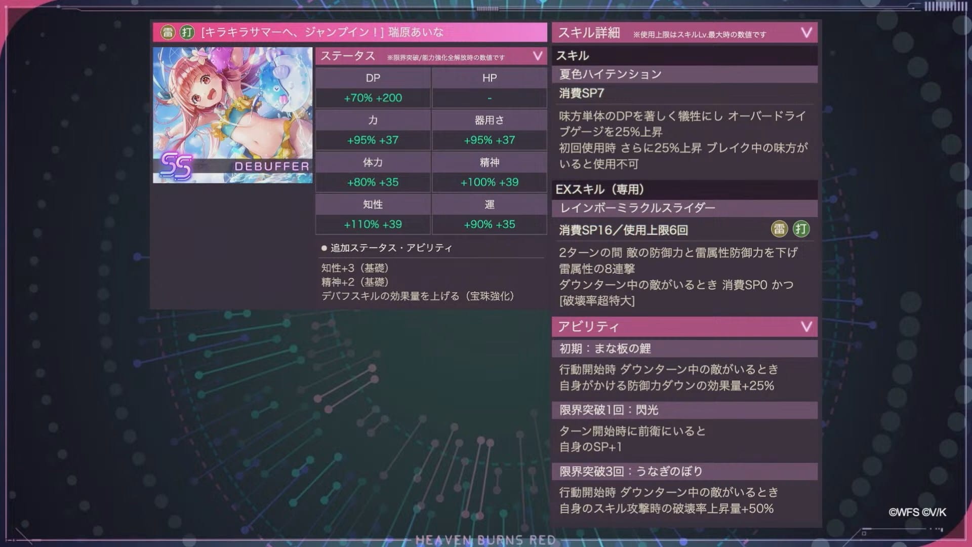 Kirakira Summer he, Jump In! - EX Skill: Rainbow Miracle Slider, 16 SP. Decreases an enemy's defense and thunder defense for two turns. 8 Hits. Costs 0 SP and has increased Devastation when an enemy in Down Turn is present.