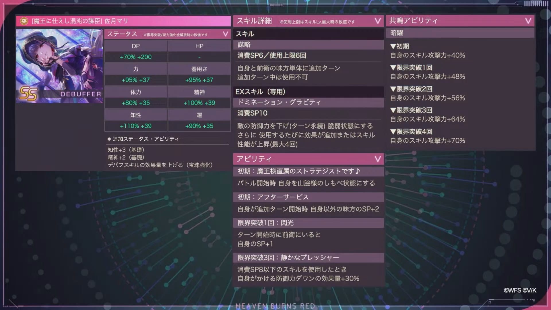 Maou ni Tsukaeshi Konton no Strategist - EX Skill: Domination Gravity, 10 SP. Decrease one enemy's Defense (infinite turns) and puts them in Vulnerable state (1 turn). This is a pure debuff Skill, it doesn't deal damage. Has additional cumulative effects depending on how many times you used the EX Skill in the same battle: