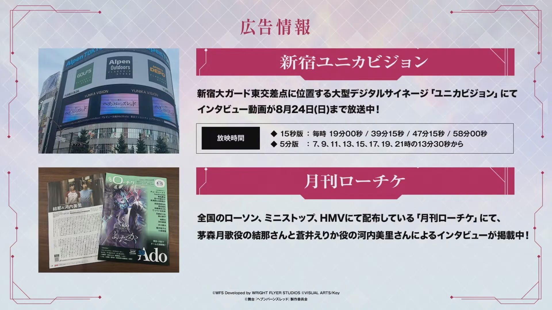 They started showing interviews of the stage play cast on the shinjuku unica vision big screen. Monthly Lawson Magazine sold in Lawson, Ministop, HMV shops around Japan will also have an interview with Ruka's actress Yuina and Erika's actress Kawaguchi Misato.