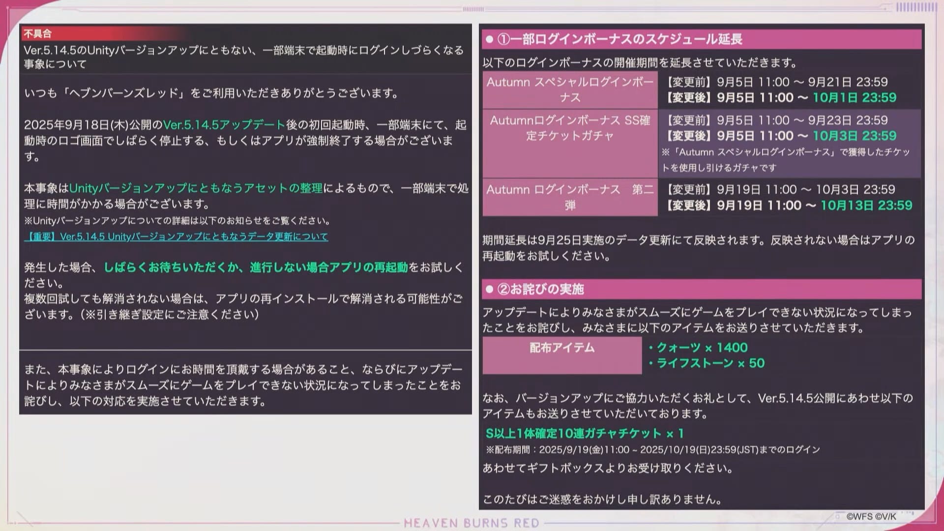 Regarding the Ver 5.14.5 update released the other day, it was an Unity version update, so it was extremely big. Some people couldn't download & update in time, and there were also bugs, so they extended some ongoing campaigns. This was already announced on Twitter.