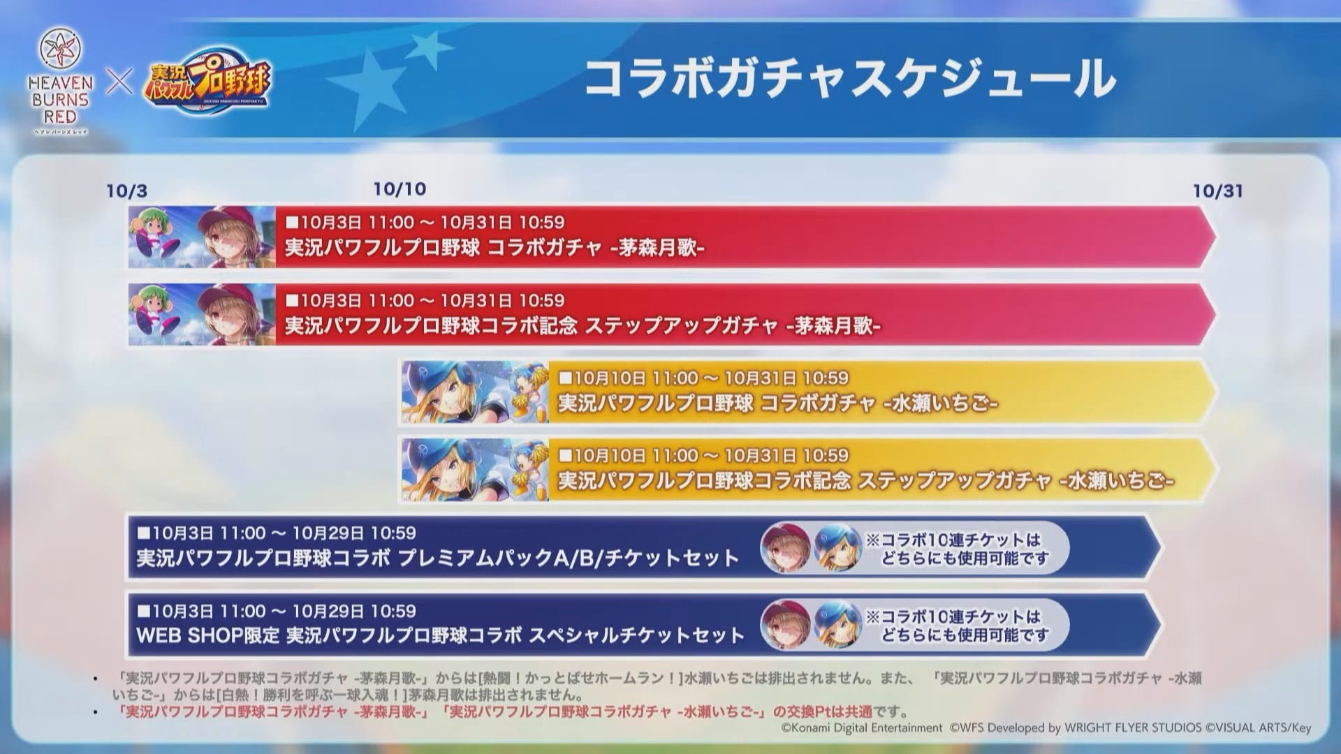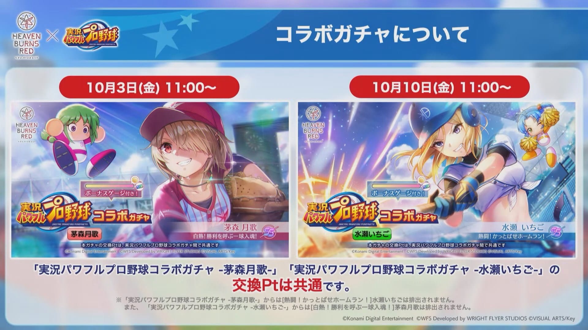 The Heaven Burns Red x Jikkyō Powerful Pro Yakyū collab was first announced during the Heaven Burns Red 3.5 anniversary event on August 3, 2025. Back then they only showed a short teaser, a key visual with Ruka and Pawapuro kun, and said the collab would happen sometime in October. The slogan on the key visual goes" Heaven Burns Red will feature the best baseball anime episode of all time".